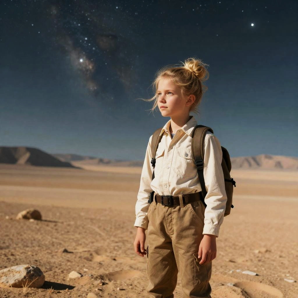 Child in orange jumpsuit, sitting on a rock, holding a yellow sock, wearing green boots, next to a metal bucket and a black boombox. Arid, rocky landscape with hills in the background, white box on the right.