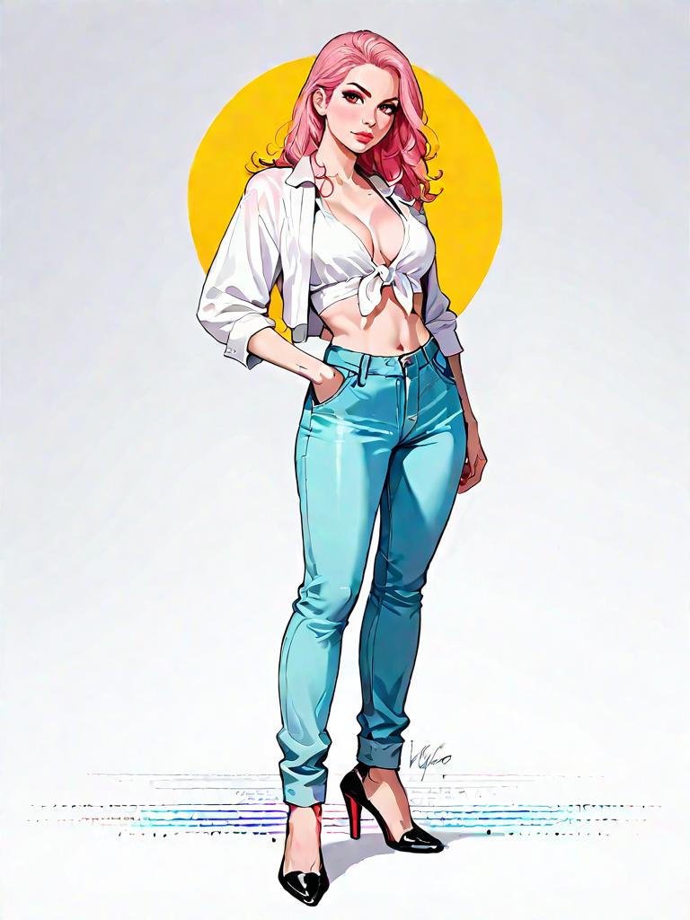 1girl, source_comics, realistic face, full body shot, Woman, modern chic, long-sleeve crop top in pastel pink with front tie detail, plunging neckline, matching high-rise flared trousers, minimalist clear strap heels, white studio background.
