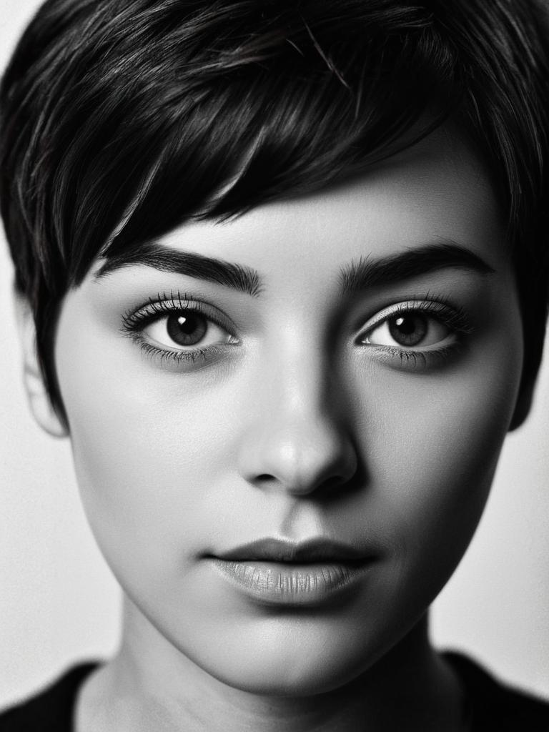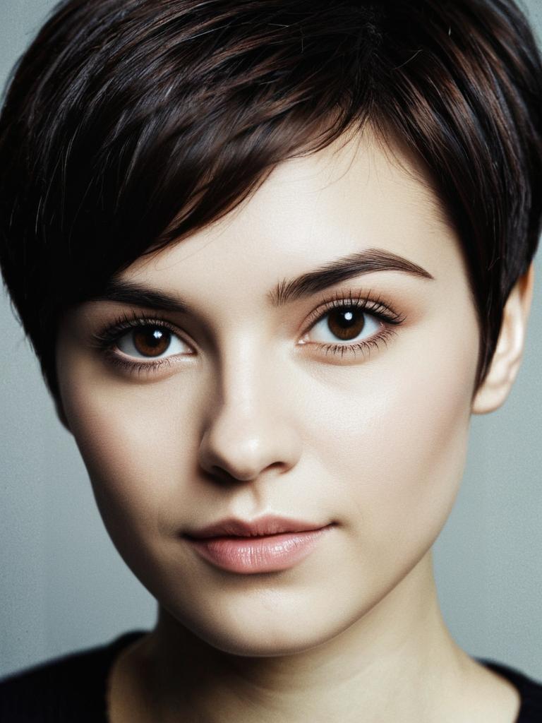 Woman with Dark Brown Pixie Cut, close-up detailed headshot