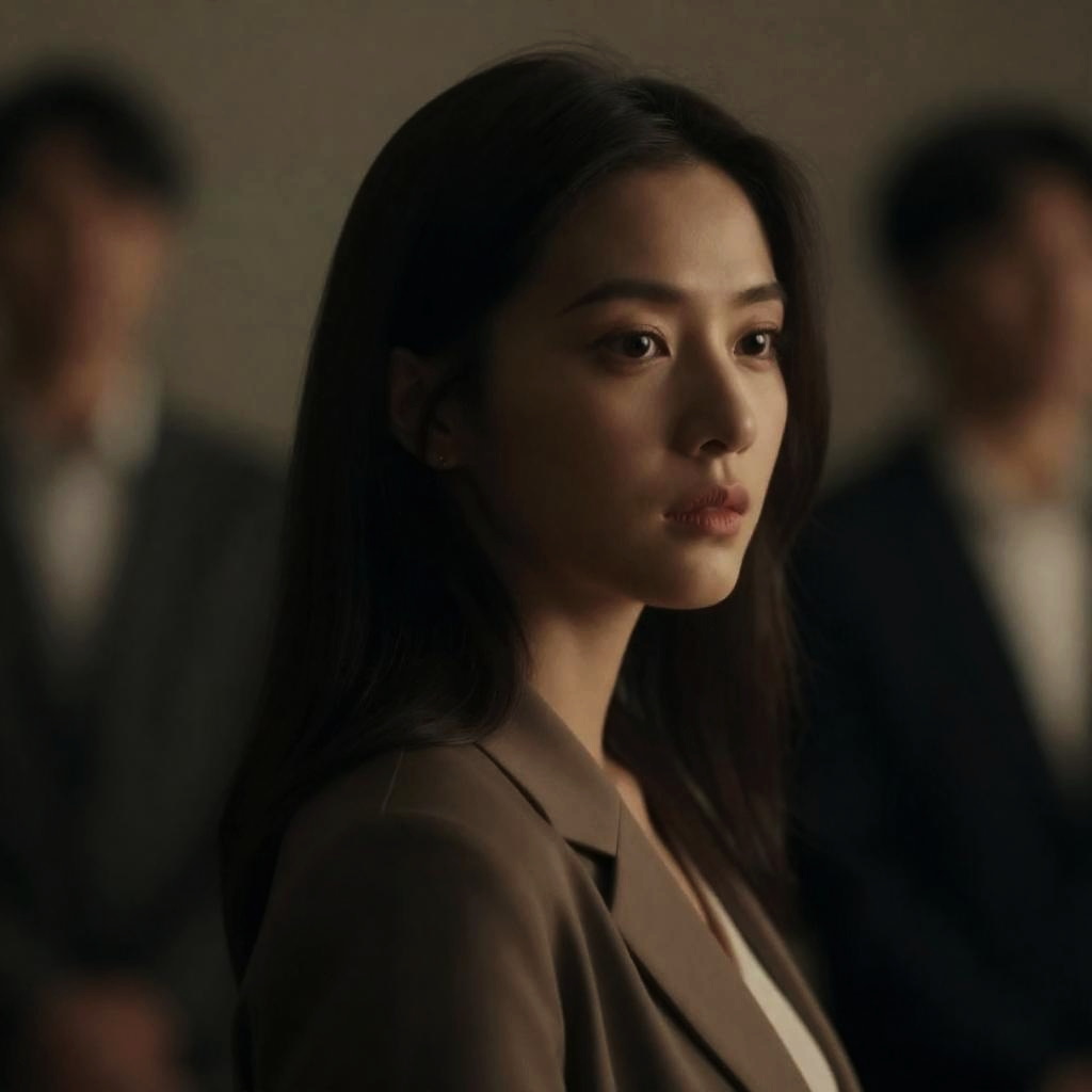 A cinematic film still featuring a focused portrait of an Asian woman with long dark hair and natural makeup, wearing a light brown blazer and white top. The background is blurred with two men in business suits, emphasizing a shallow depth of field and moody lighting. The image has a grainy, high-budget, and detailed film grain effect with bokeh highlights, creating a dramatic and epic atmosphere.