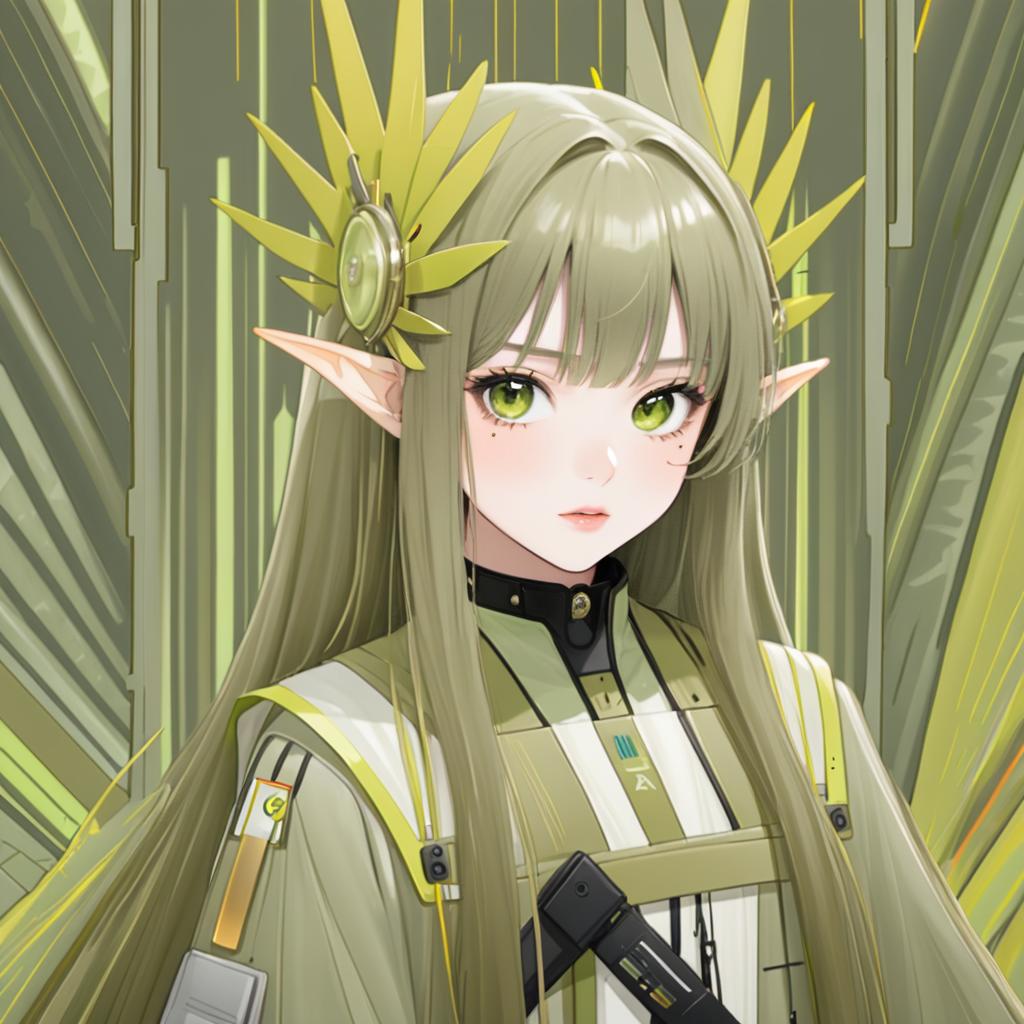 Muelsyse (arknights), arknights, 1girl, pointy ears, yellow eyes, mole under eye, very long hair, brown hair, long hair, long sleeves, black choker, elf, by artist sakiyo cake, anime