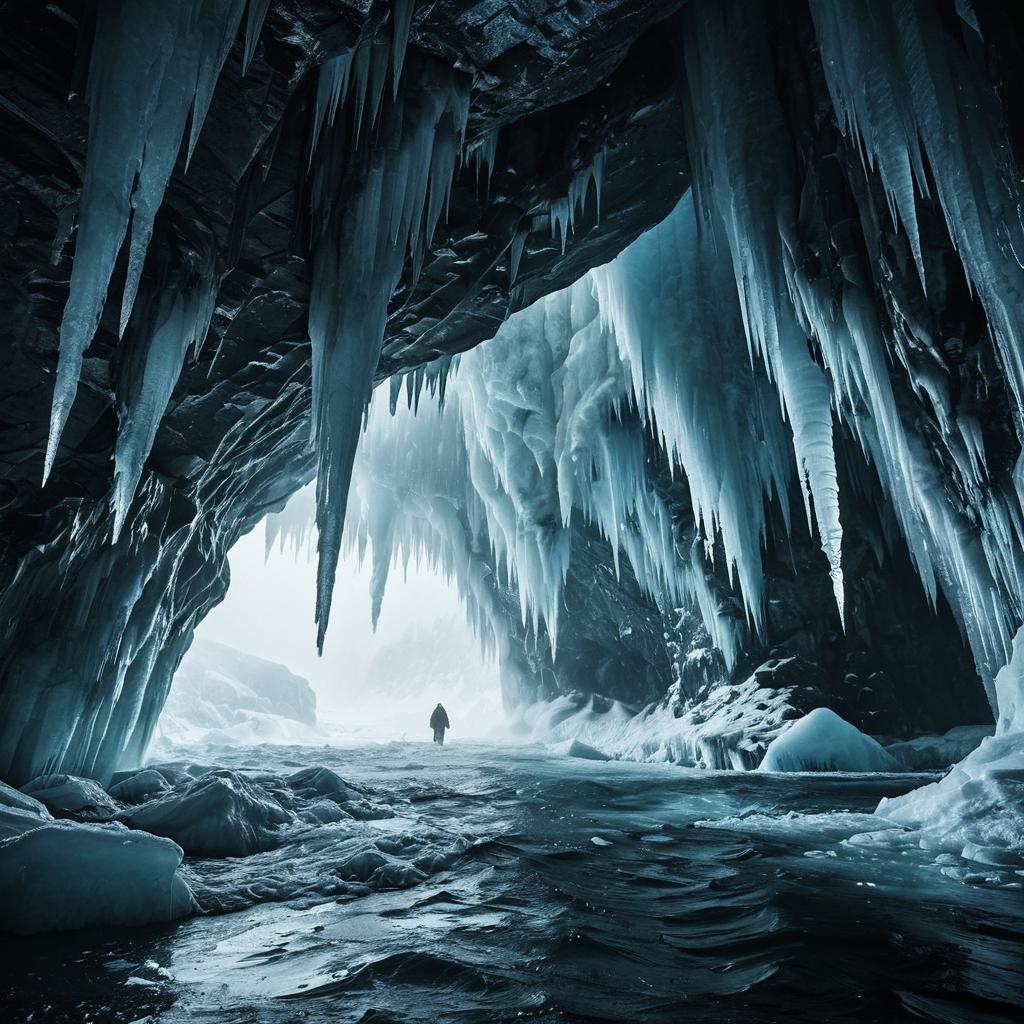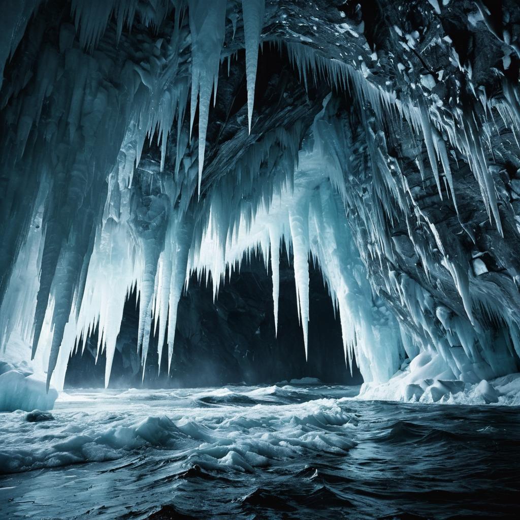 Detailed and high-quality image of a giant ice cavern featuring sharp, glinting icicles hanging from the ceiling. The cavern floor is partially covered with ice and waves of frozen water, evoking a haunting and mysterious atmosphere. The interplay of light highlights the icy textures and frozen mists, illustrating a surreal and chilling environment resembling a high sea cave in winter.