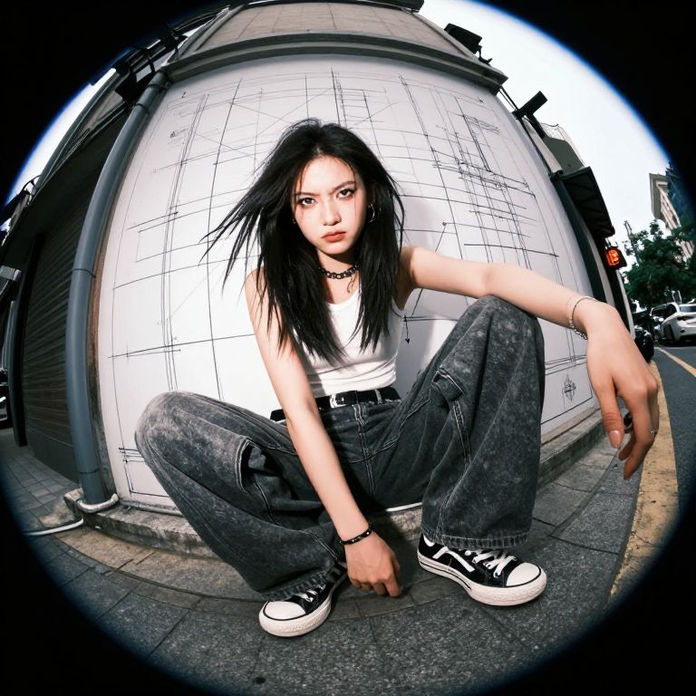 A technical CAD drawing of a aesthetic, asian girl in a dynamic pose taken on a fish eye lens, sitting on the street corner, she has a rebellious pissed off expression and is wearing urban streetwear, in the style of flash photography, realistic body traits, schematics and geometrical lines