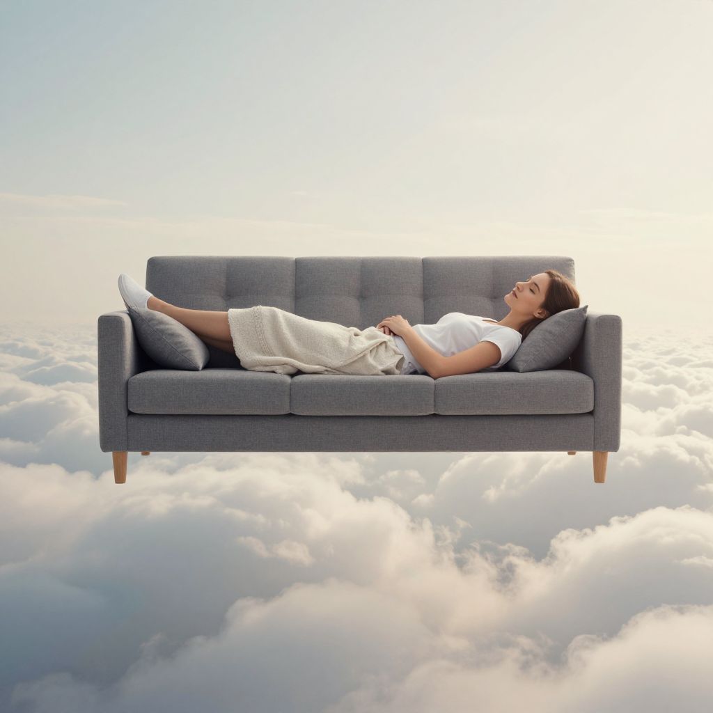 A serene woman rests peacefully on a gray sofa suspended above a vast expanse of fluffy clouds, her tranquil presence evoking a dreamlike atmosphere beneath a soft, ethereal sky.
