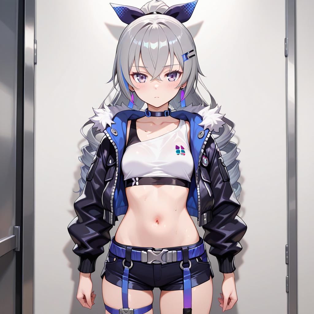 Best quality, masterpiece, illustration, an extremely delicate and beautiful, extremely detailed, CG, unity, 8k wallpaper, Amazing, finely detail, official art, extremely detailed CG unity 8k wallpaper, absurdres, incredibly absurdres, ultra-detailed, highres, beautiful detailed girl, extremely detailed eyes and face, beautiful detailed eyes, light on face, 1girl, bronya zaychik, bronya, silver_wolf, grey hair, ponytail, grey eyes, small_breasts, shorts, shot_jacket, belt, earrings, hairclip, looking at viewer, garters, choker, (navel:1.1), collarbone, sweat
