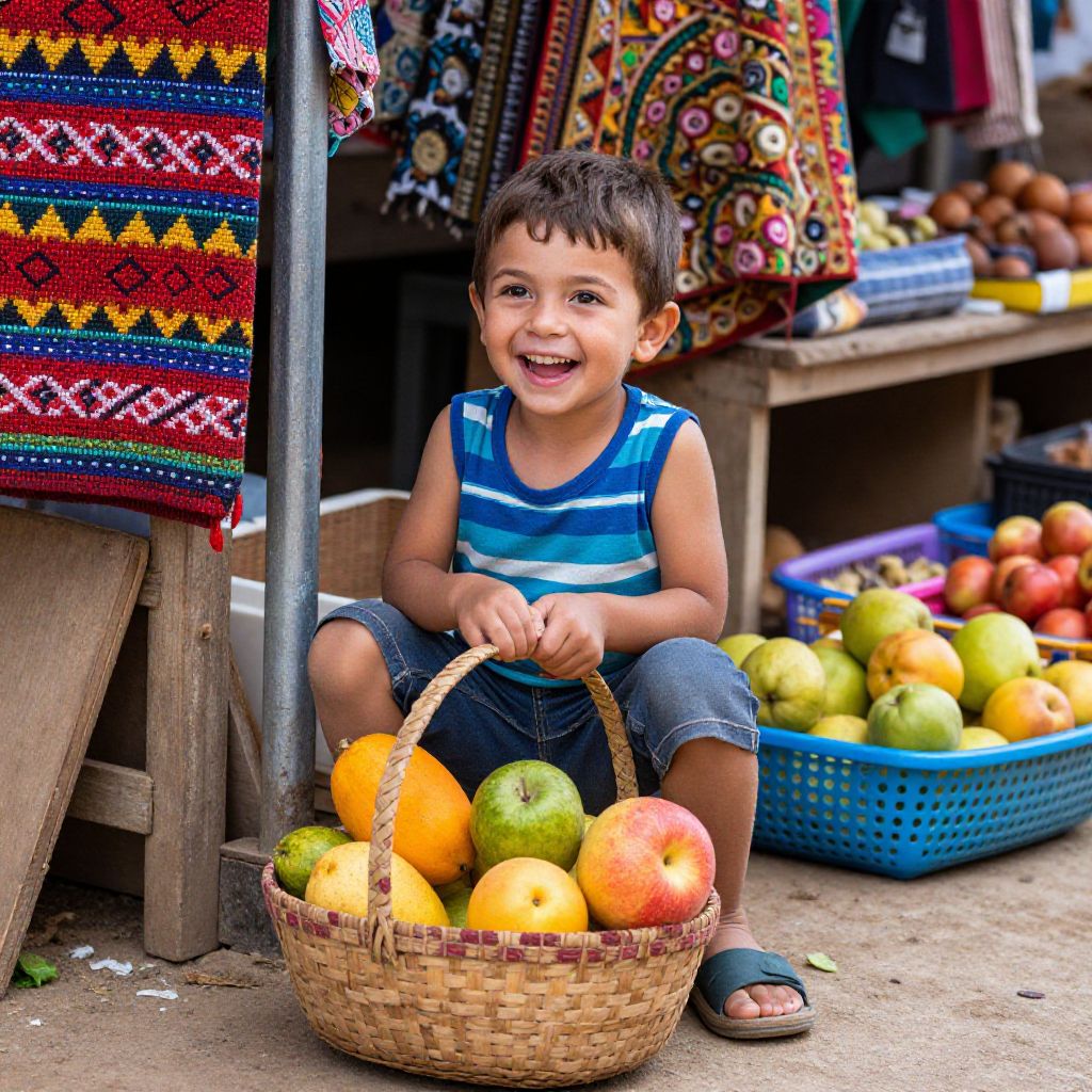 In a sunlit marketplace, an elderly woman and a child sit amidst scattered pebbles, their shared laughter weaving a timeless thread of connection, where whispers of forgotten lullabies echo like echoes of eternity, bridging generations with the warmth of shared joy and the tender promise of enduring memories.