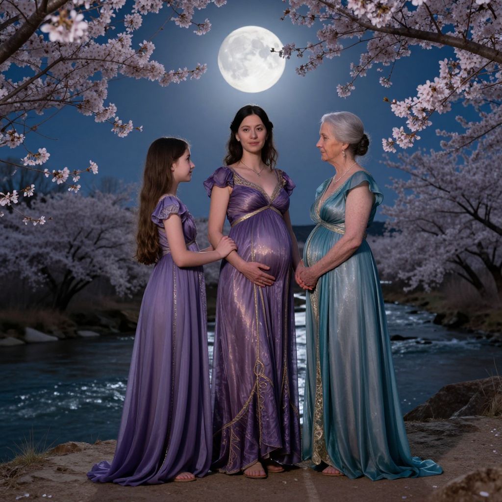In this enchanting, UltraHD photo-realistic 8K artwork, three women stand in symmetrical alignment under a full moon, casting a serene glow over the scene. The woman on the left, a young girl, stands gracefully to the left of the frame, her long hair cascading down her back. The middle woman, a pregnant woman, holds the hands of the woman on the right, an elderly woman, who stands to the right of the frame. All three women are adorned in flowing, art nouveau-inspired dresses in shades of purple and teal, with gold accents that shimmer subtly in the moonlight. Cherry blossoms frame the scene, their delicate petals adding a touch of softness and elegance. The women are positioned on a rocky outcrop, with the Colorado River flowing gently in the background, its surface reflecting the moon's luminous light. The overall composition is balanced and harmonious, with the women's poses and the natural elements creating a sense of unity and tranquility.