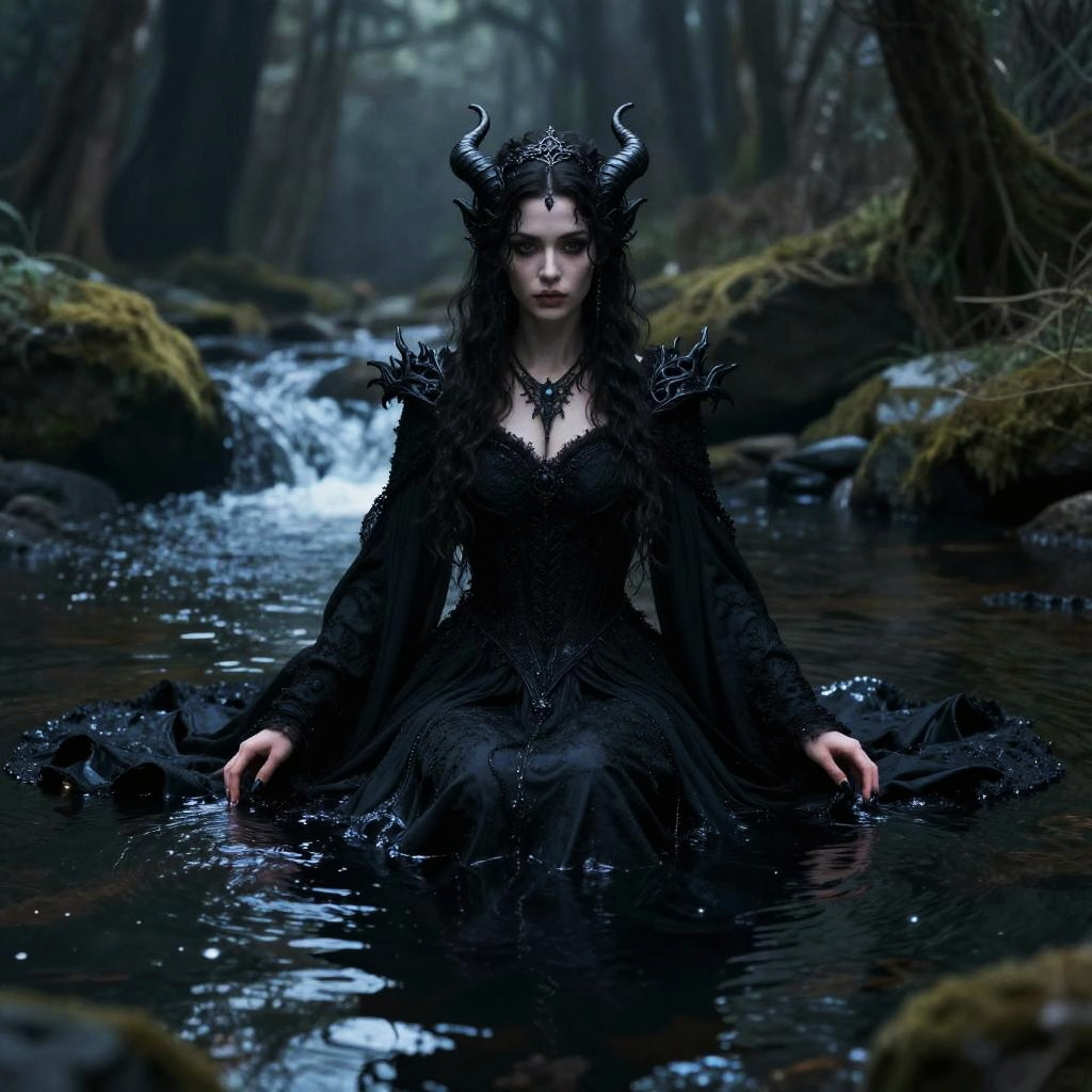 Photograph of a dark fantasy scene featuring a pale-skinned woman with black, wavy hair, and black horns on her head, wearing a detailed black lace gown with intricate shoulder embellishments. She is sitting in a shallow, clear forest stream with a small waterfall in the background. The forest is dense with tall, dark trees and moss-covered rocks. Her expression is serious and her eyes are piercing. The water reflects the dim, moody light of the forest, enhancing the mystical and eerie atmosphere. The overall color palette is dark and cool, dominated by blacks, blues, and greens.