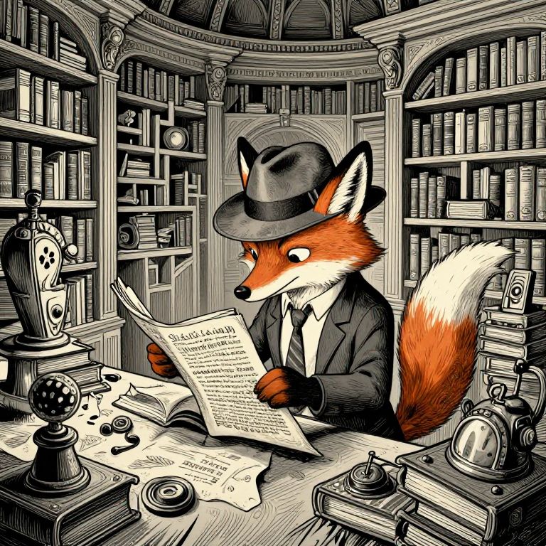 A detailed digital illustration depicts an anthropomorphic fox in a vintage library setting. The fox, with a bright orange and white fur, wears a dark suit and a fedora hat, sitting at a cluttered wooden desk. He reads a newspaper, surrounded by old-fashioned typewriters, inkwells, and stacks of books. The background features tall, arched bookshelves filled with numerous books. The fox's expression is focused, and the scene is rendered in a black-and-white with vibrant orange highlights, giving it a classic, noir-style appearance.