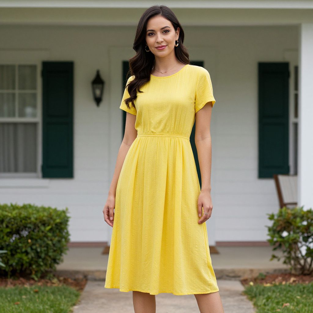 Sandy Grease Yellow Dress, woman in a yellow dress standing in front of a house