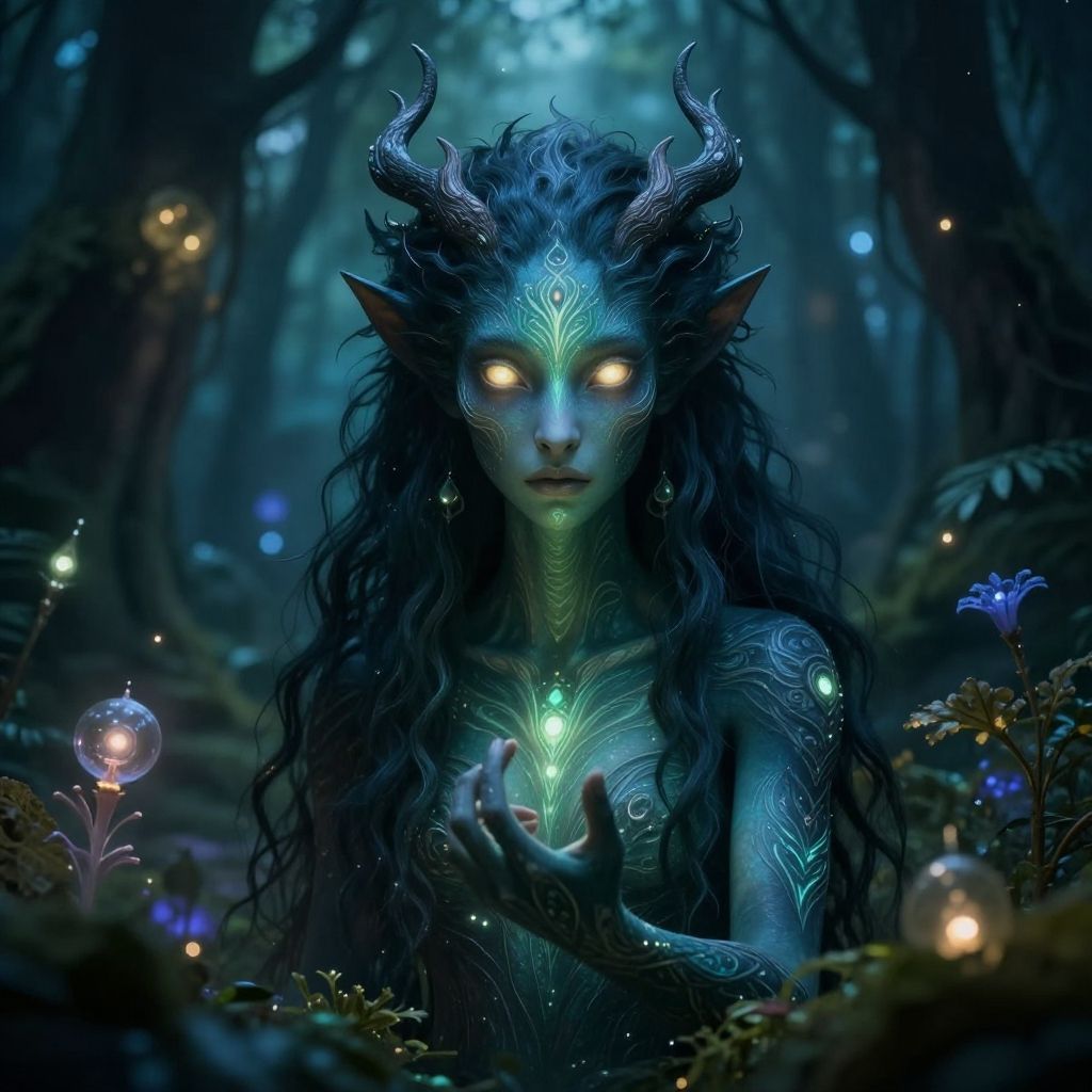 Digital fantasy artwork of a glowing green-eyed elf with dark hair, large antlers, pointed ears, and mysterious forest background.