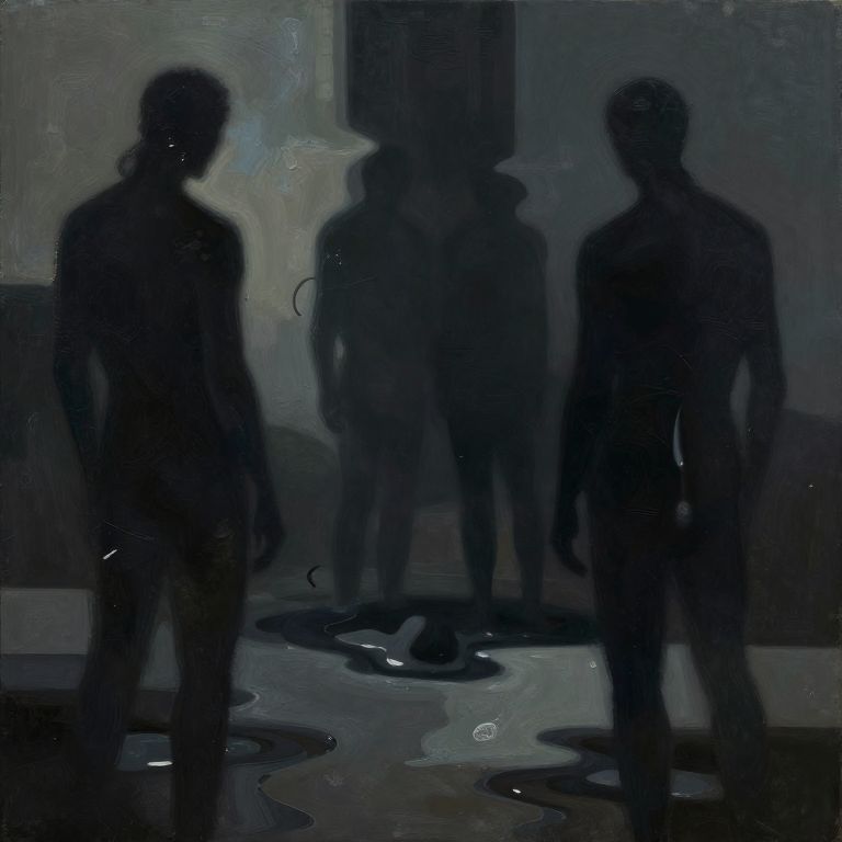 Digital painting of dark, shadowy silhouettes of four people standing in a dimly lit room with a reflective, glossy floor.