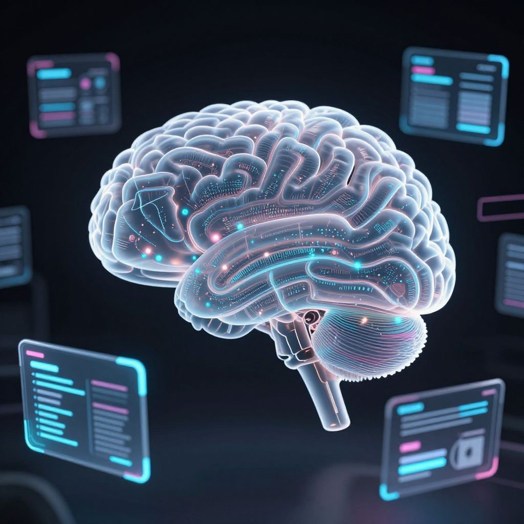 Digital CGI image featuring a glowing, neon-lit human brain floating in a dark, futuristic environment. The brain is outlined in bright white with blue and pink neon accents, highlighting its intricate folds and structure. Surrounding the brain are multiple neon-lit computer screens displaying text and data in blue and pink. The overall style is cyberpunk, with a high-tech, sci-fi aesthetic. The background is dark, emphasizing the bright, illuminated brain and screens. The image conveys a sense of advanced technology and brain-computer interface themes.