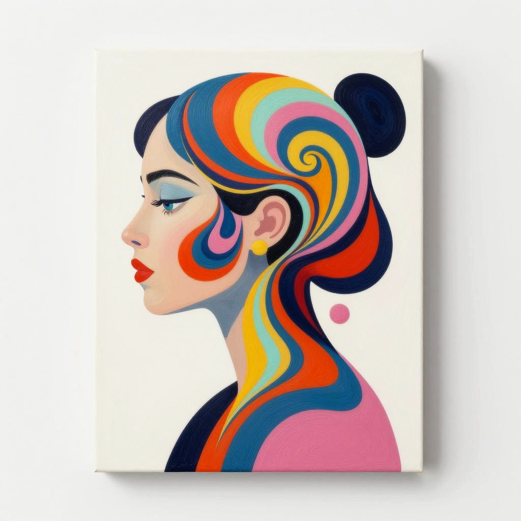 This captivating artwork features a vibrant and colorful depiction of a woman's profile, intertwined with fluid, swirling patterns. The use of bold hues and dynamic shapes creates a mesmerizing sense of movement, embodying a modern artistic style that combines elements of abstraction and surrealism.