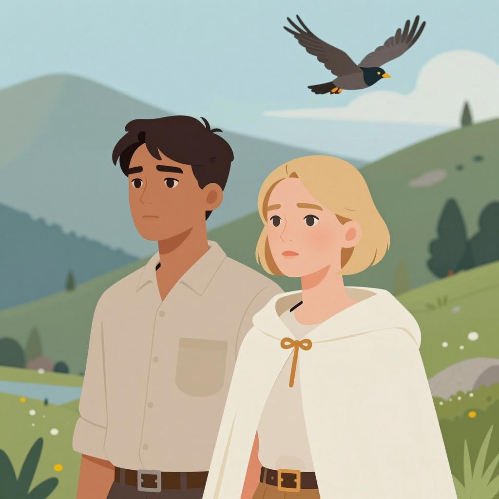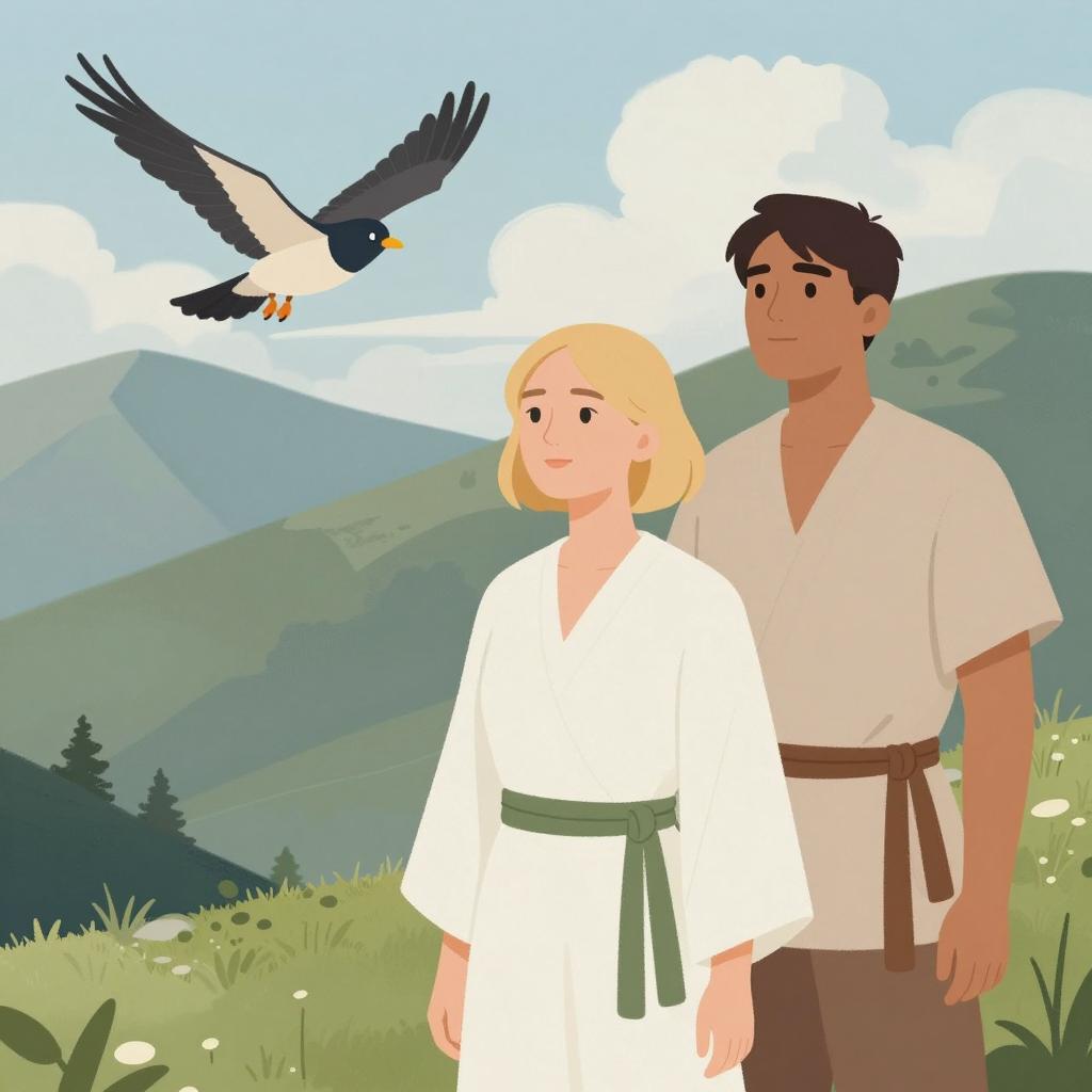 Illustration of two people in a mountainous landscape with a flying bird in the background. The woman with short blonde hair and a white robe stands in the foreground, looking to the right. The man with short dark hair and a beige tunic stands behind her, looking forward. The bird is in mid-flight to the left. The background features green hills and a cloudy sky.