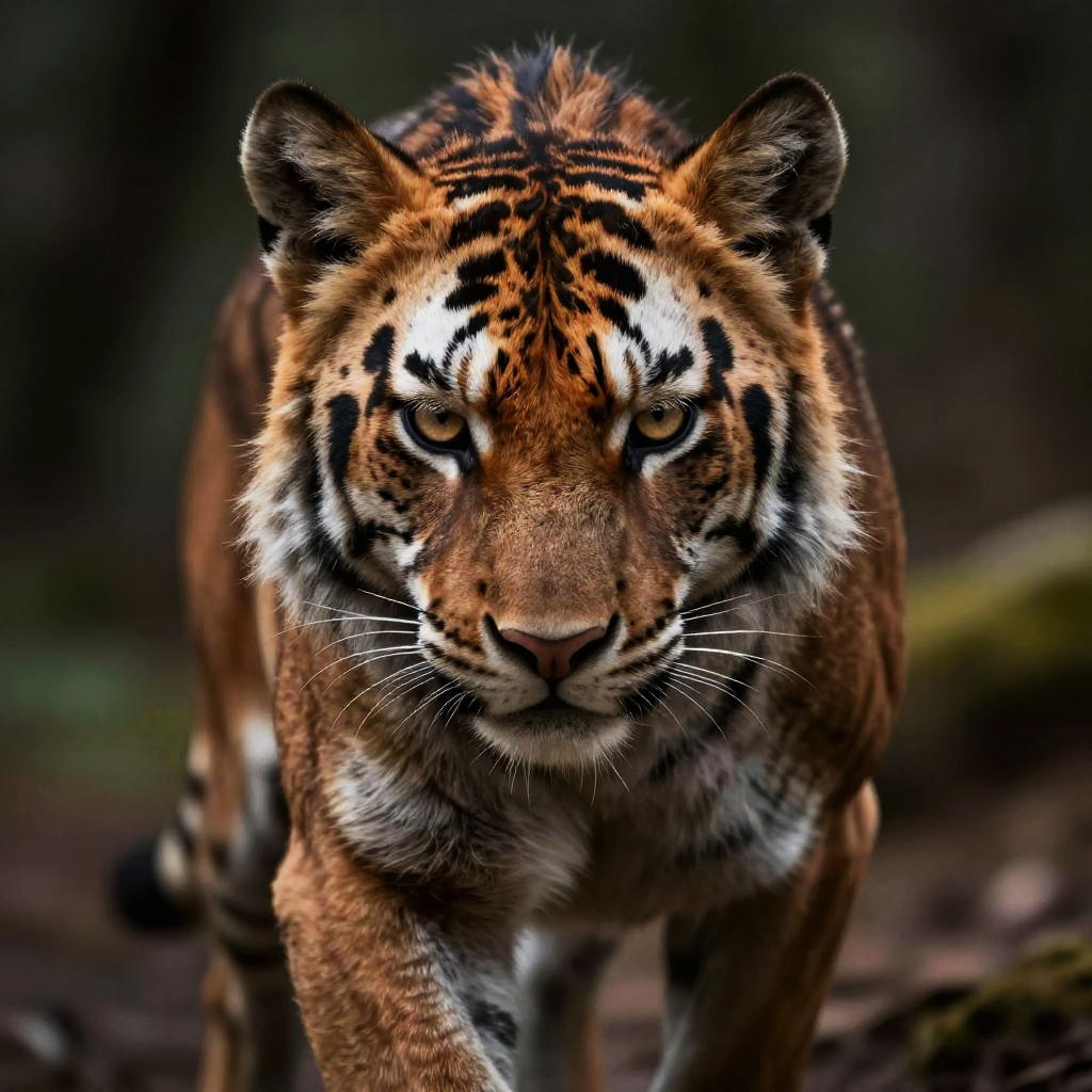 Close-up portrait of beartype animal with fierce eyes and intricate fur patterns, rich earth tones with subtle magical elements, dynamic lighting highlighting muscle structure and powerful stance, hyperrealistic style in a natural wilderness setting