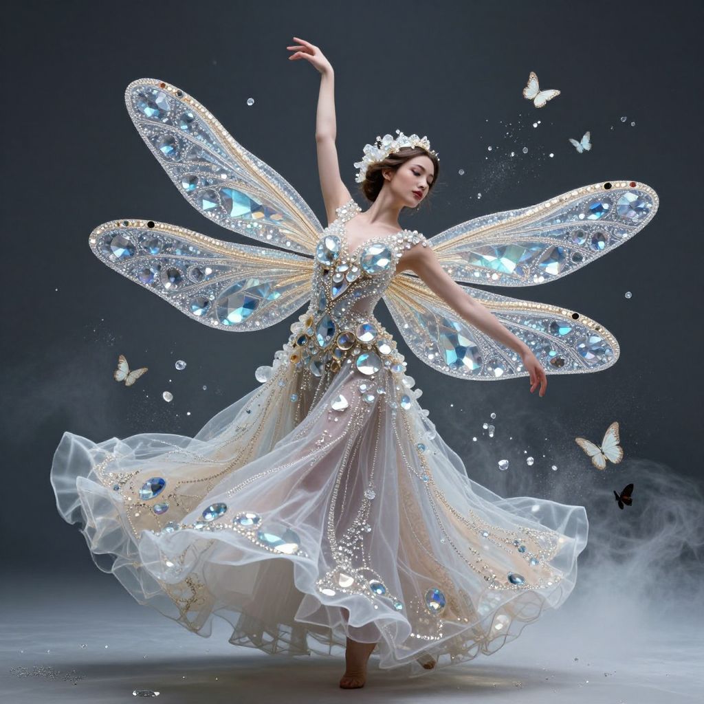A woman in a detailed, layered, opalescent dragonfly wing gown with giant crystals and delicate filigree dances in a dynamic pose, surrounded by an explosion of butterflies and mist, creating a photographic fashion masterpiece with intricate details and a deep sense of movement.