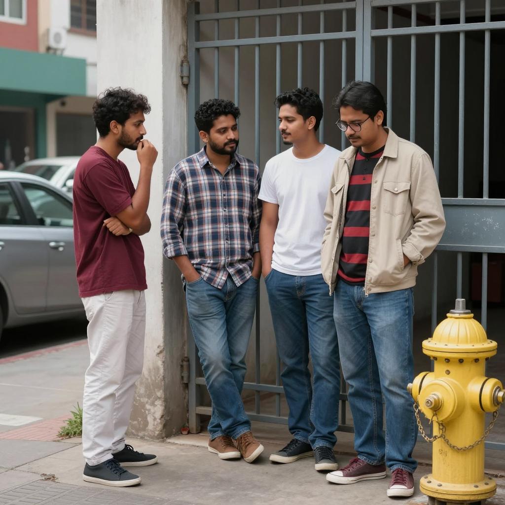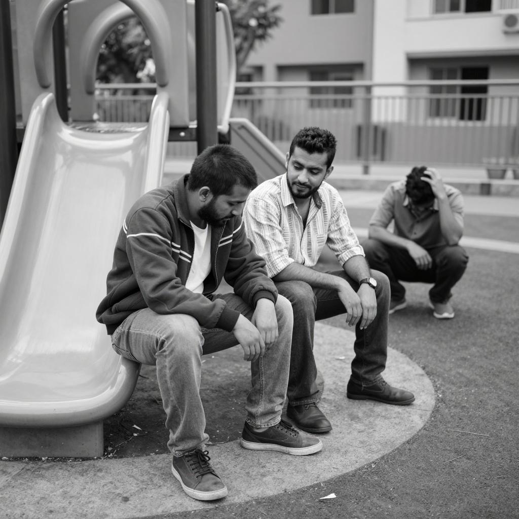 Three men in a playground. Two men sit on a circular stone platform; one wears a striped jacket and looks down, the other in a patterned shirt looks at the man next to him. A third man crouches near a concrete slide, scratching his head. Background includes a fence and buildings.