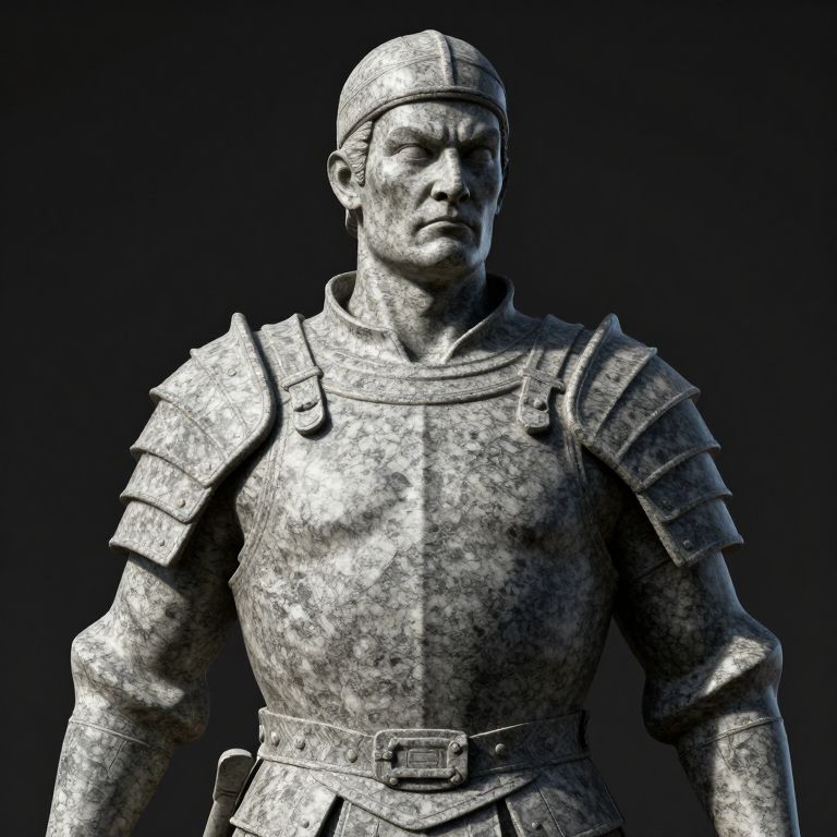Chisled granite sculpture of a warrior in armor, strong defined features and sharp edges, dramatic side lighting casting deep shadows, set against dark moody backdrop, hyperrealistic 3D render