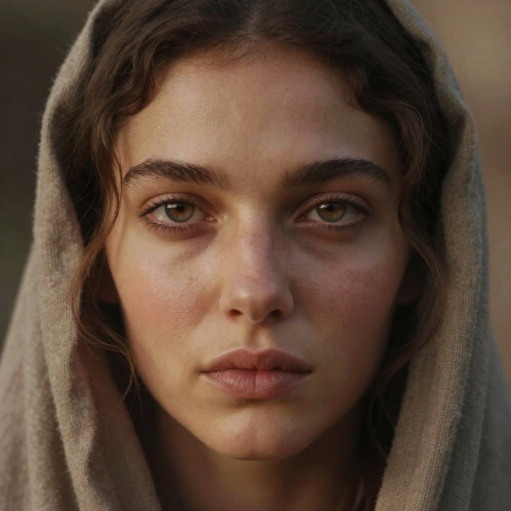 This is a highly detailed, realistic photograph of a young woman with a serious expression, centered in the frame. She has light brown skin, greenish-brown eyes, and slightly flushed cheeks. Her dark brown hair is partially covered by a rough, beige fabric hood. The texture of the fabric contrasts with her smooth skin. The background is blurred, focusing attention on her face. Her eyebrows are thick and natural, and her lips are slightly parted. The lighting is soft, highlighting her facial features and giving a subtle glow to her skin. The overall mood is solemn and introspective.
