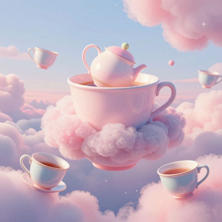 Tone Mapping surrealist maximalist illustration, Pastel clouds utopia, antigravity tea cups, UHD digital illustration,