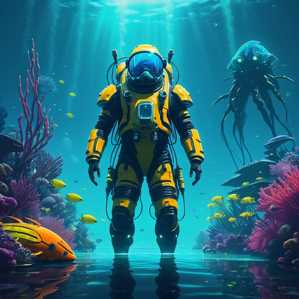 A bold underwater explorer with a futuristic suit and glowing sea creatures, colorful and cinematic style by Simon Stålenhag, Greg Rutkowski, Ian Miller.
