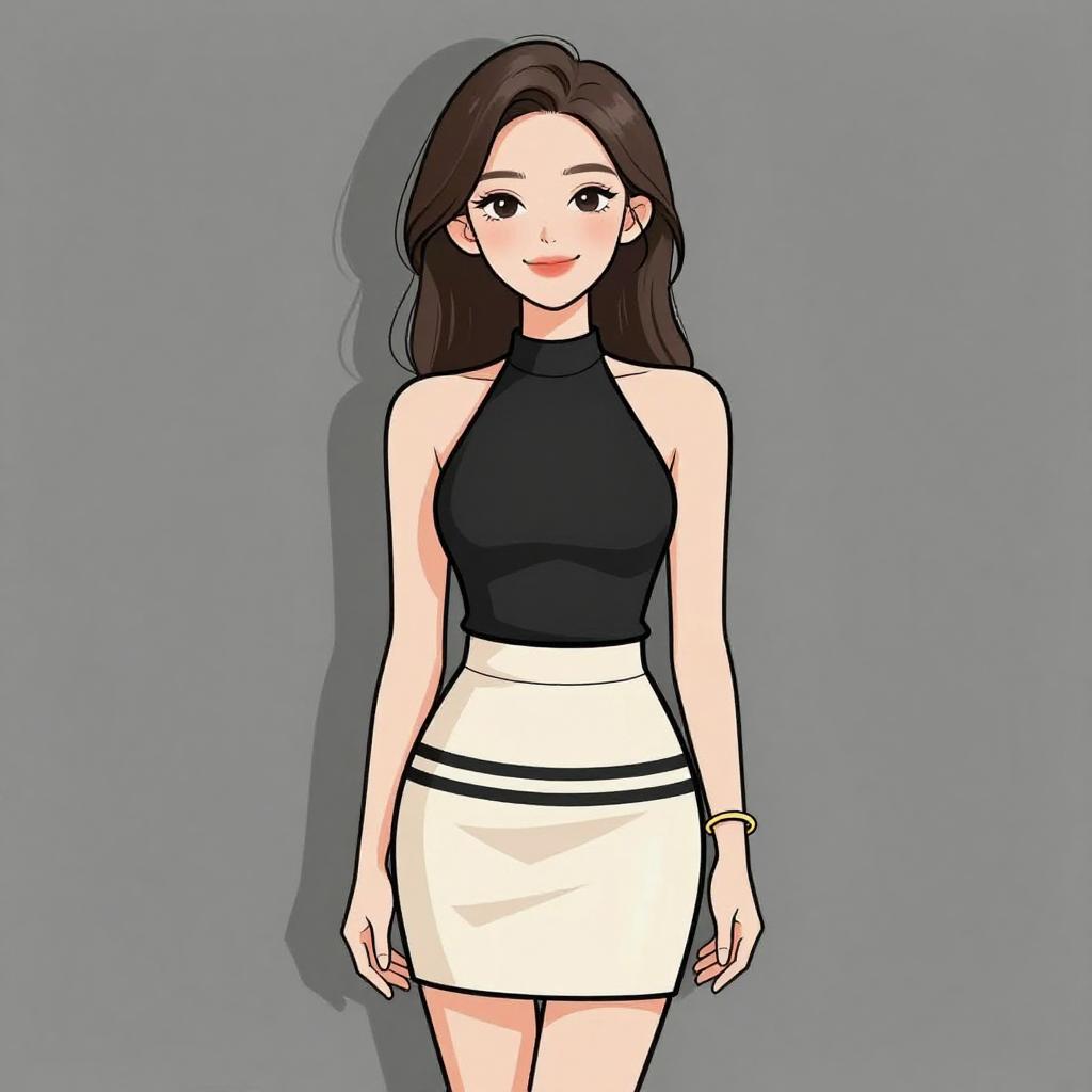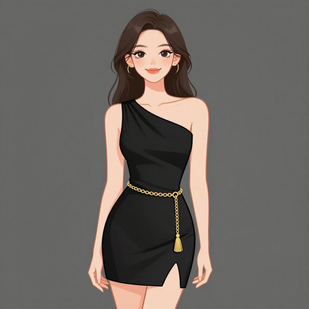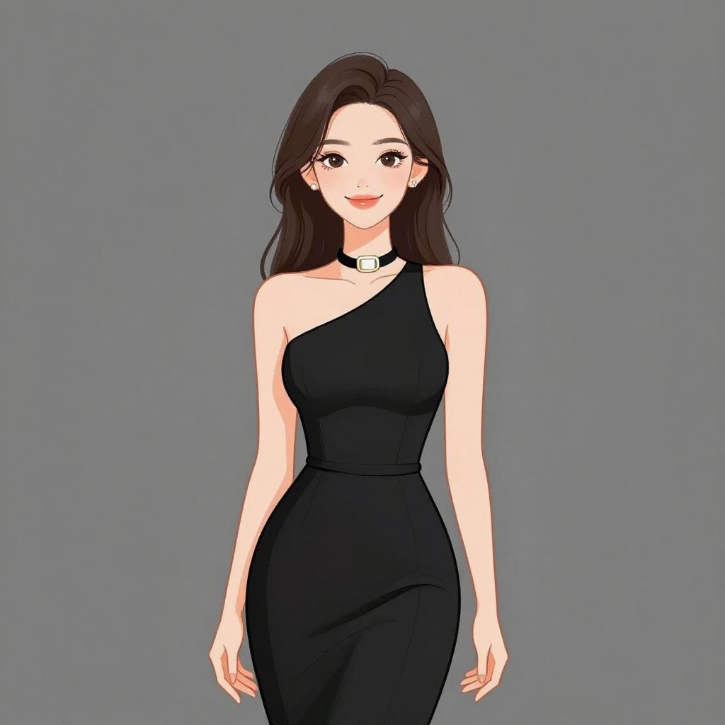 Woman with pretty face and pretty hair. smiling Woman, elegant, black halterneck bodysuit, one-shoulder design, fitted silhouette, statement choker with metallic details. --sref 1467