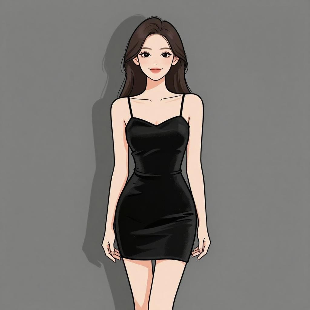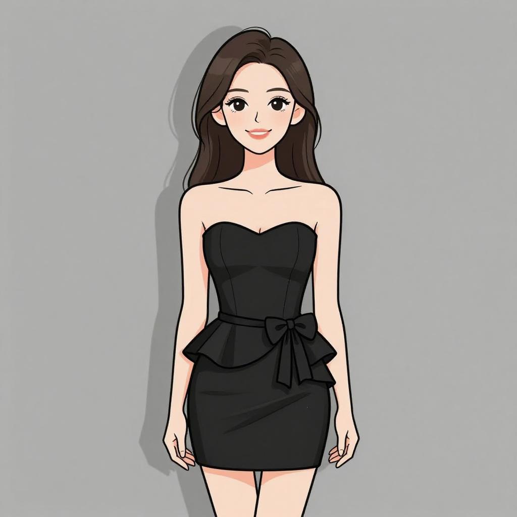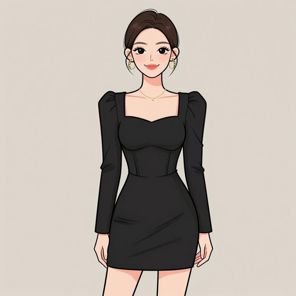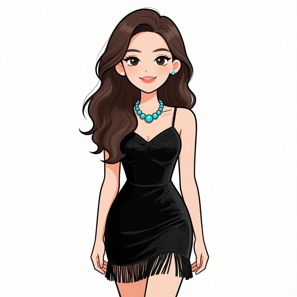Woman with pretty face and pretty hair. smiling Woman, elegant, black halterneck bodysuit, one-shoulder design, fitted silhouette, statement choker with metallic details. --sref 1467