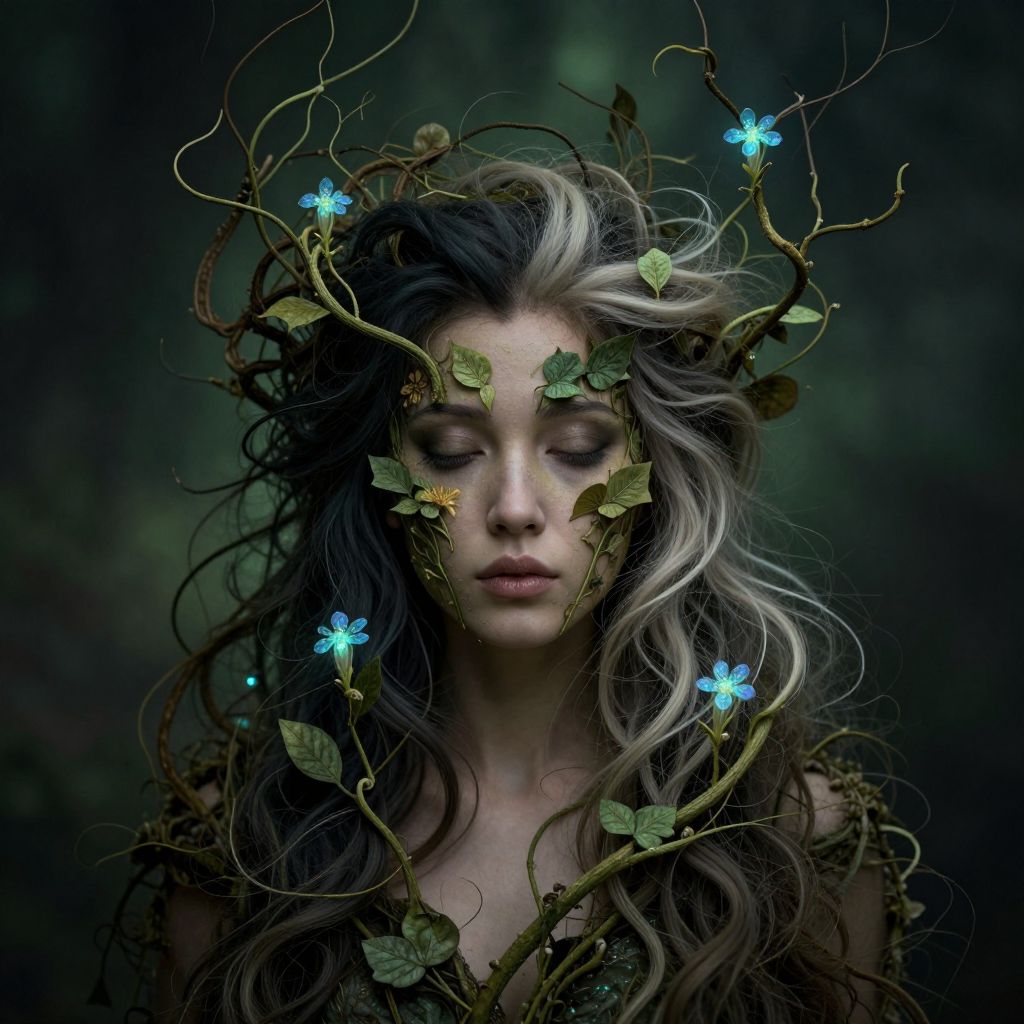 The image depicts a mystical and ethereal scene, dominated by a woman whose face is adorned with intricate, nature-inspired elements. Her hair, a blend of dark and light tones, flows freely, intertwined with delicate vines and leaves that seem to grow and intertwine around her head. The vines are adorned with small, glowing blue flowers, adding a magical touch to the scene. The background is a dark, almost ominous green, with subtle hints of light filtering through, creating a sense of depth and mystery. The overall composition is balanced, with the woman's face centrally positioned, drawing the viewer's attention to the detailed textures and colors of the vines and leaves. The interplay of light and shadow enhances the mystical atmosphere, making the image appear both serene and otherworldly.