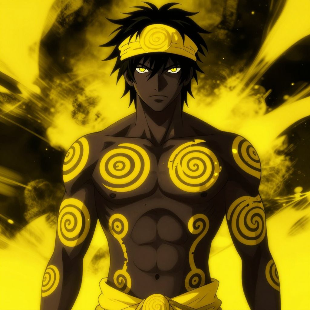 Anime-style digital illustration of a muscular, dark-skinned male with glowing yellow eyes, black spiky hair, and yellow spiral tattoos, wearing a yellow