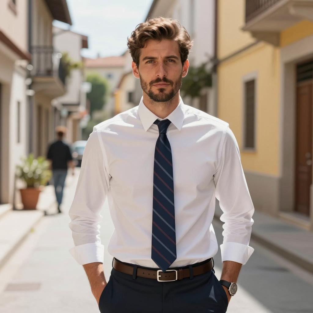 Man shirt styles costume, photograph of a young man, standing outdoors, daytime, modern building background, shallow depth of field, man with short brown hair, light stubble, slight smile, wearing a blue-gray button-up shirt, long sleeves, shirt pocket, hands by sides, sunny, light shadows, casual look, realistic, portrait orientation, front view, mid-20s, handsome, light skin tone