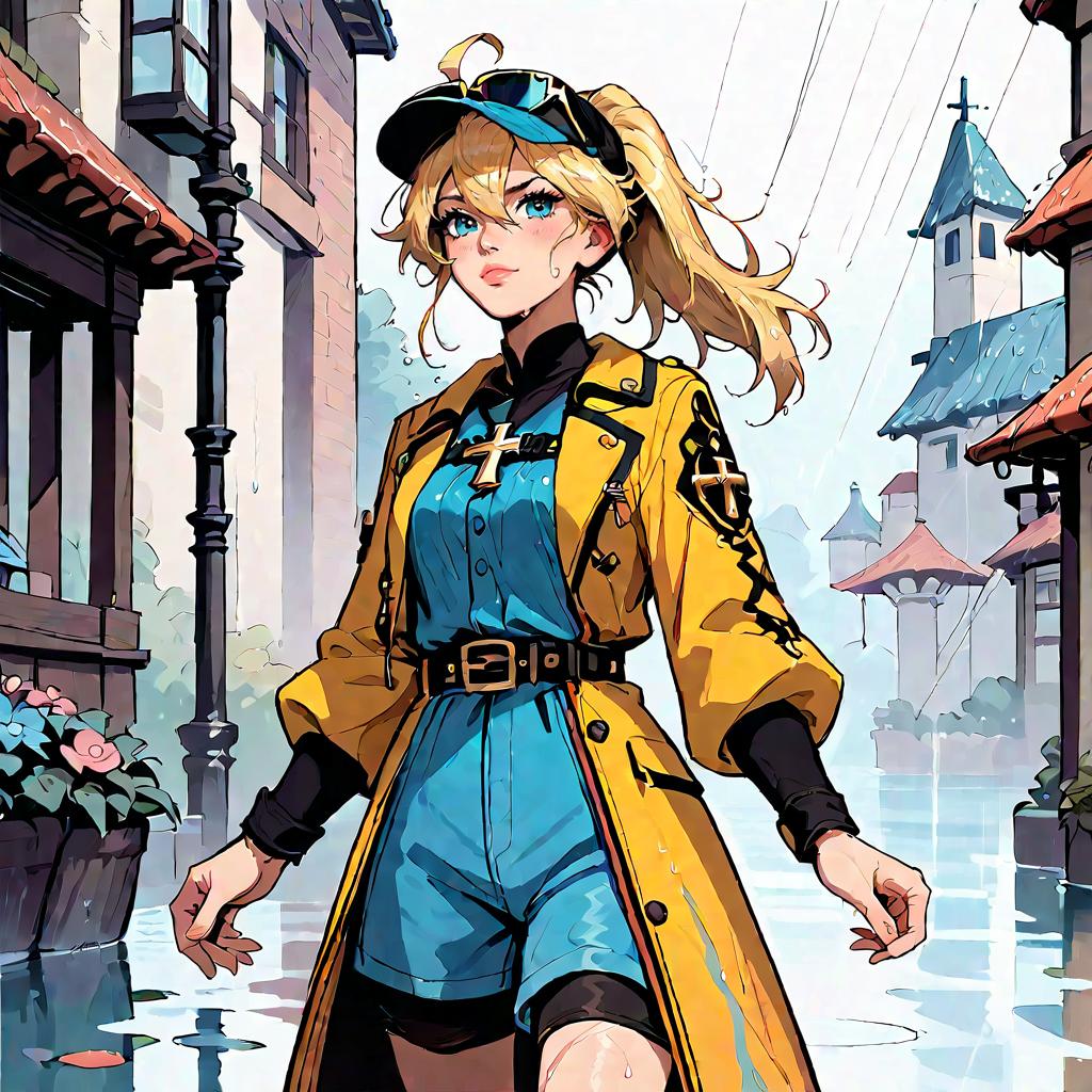 Score_9, score_8_up, score_7_up, TanyaDegurechaff, dark tunic clothing style, 1girl, solo, long hair, bangs, blue eyes, blonde hair, long sleeves, hair between eyes, standing, ponytail, ahoge, sidelocks, cowboy shot, outdoors, belt, blurry, coat, wet, cross, rain, wet hair, source_anime, cap, thisrt, shorts, sunglasses, mad expression, hands in the air, laughing