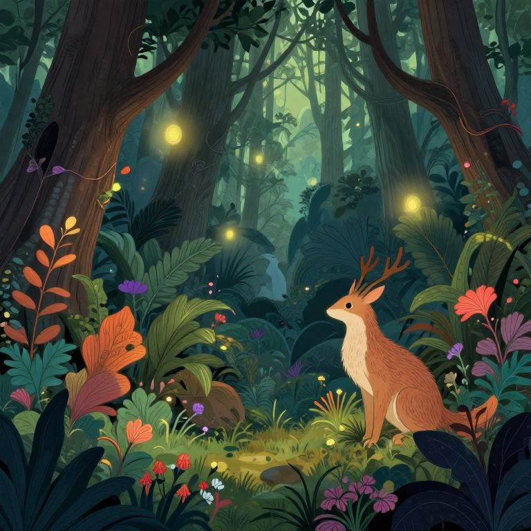 Deepart AI image generator illustrating an otherworldly forest inhabited by bioluminescent plants and mythical creatures, rendered in rich, saturated colors and organic flowing shapes, blending natural elements with abstract AI-driven patterns for a mystical fantasy scene.