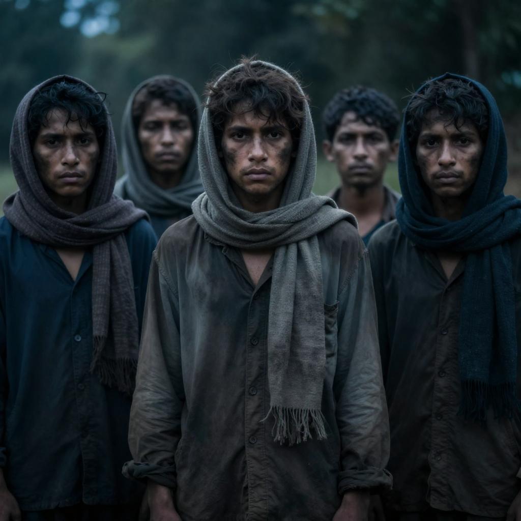 Photograph of a group of children in dark, vintage clothing with head coverings, standing outdoors in a sunlit, dusty area. Three children in the foreground, two girls and one boy, clasping hands and looking solemnly forward. Background includes more children in similar attire, some with hats, all standing closely together.