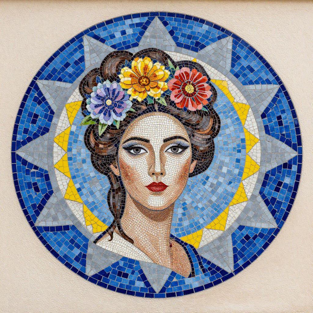 Mosaic artwork featuring a detailed portrait of a woman with intricately styled hair adorned with three colorful flowers, set against a vibrant circular background composed of blue, gray, and yellow geometric tiles.