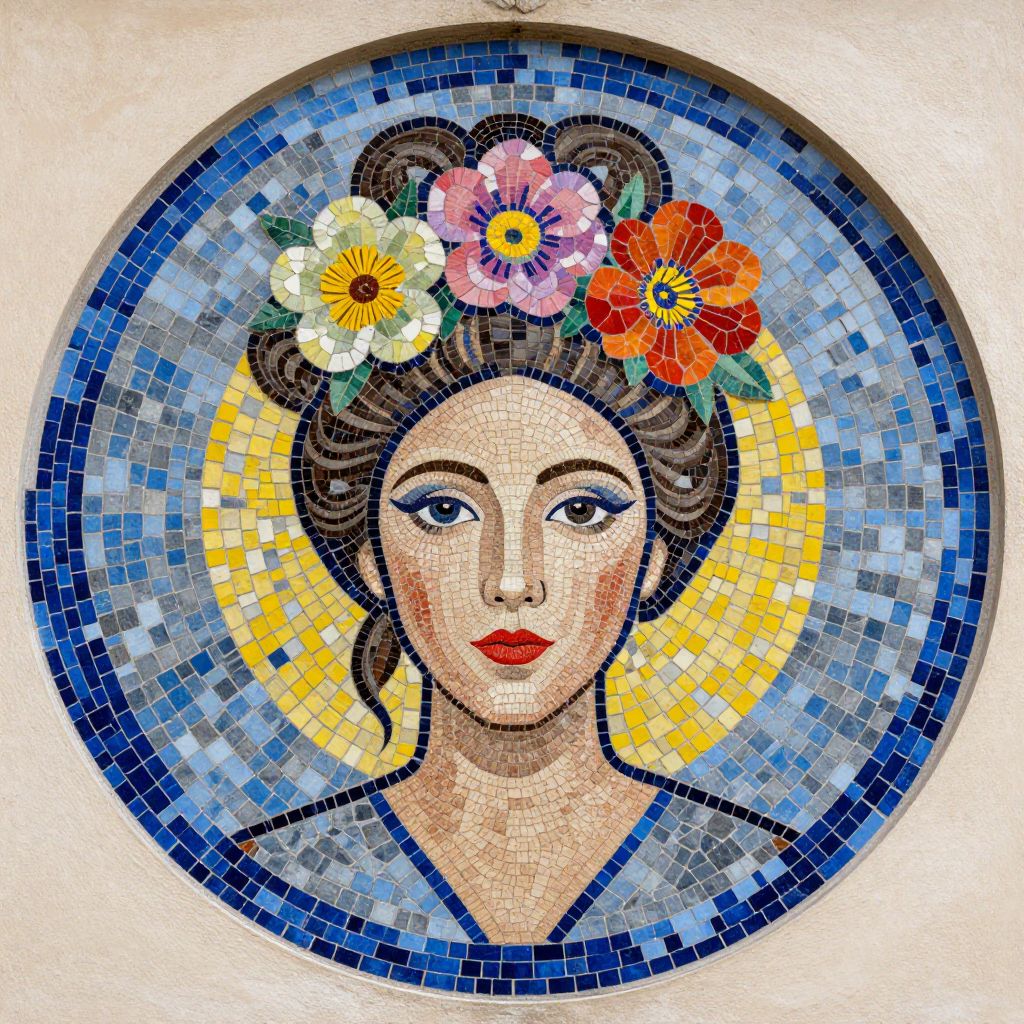 Mosaic portrait of a fair-skinned woman with red lips, blue eyes, and brown hair adorned with colorful flowers, set against a blue and yellow