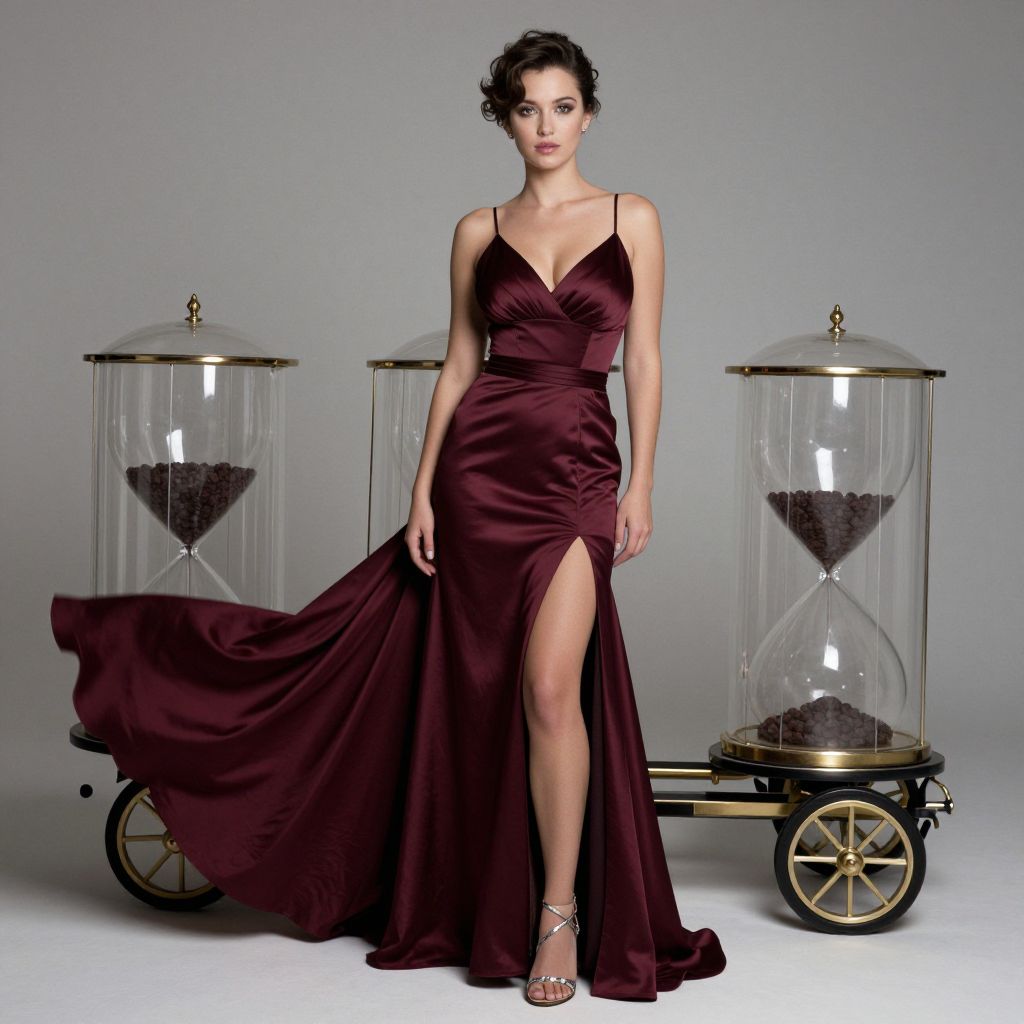 A Hourglass woman, elegant, satin evening gown in muted burgundy, sleeveless, V-neck, spaghetti straps, fitted waist, high-thigh slit, floor-length with a flowing skirt, metallic strappy heels, Wonderland train with transparent carriages. Visual style: ektachrome film stock Sexy. Pretty face and beаutiful eyes. Big breasts