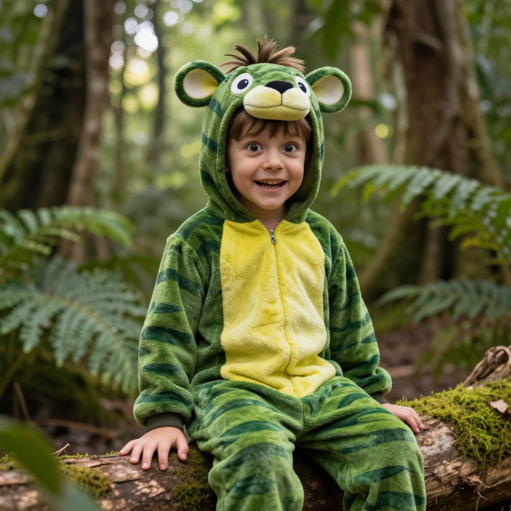A playful young boy with a kinda short hairstyle, dressed in a cartoonish jungle animal costume with green and yellow stripes, sitting on a mossy log in a tropical forest with sunlight filtering through the trees, his face wide-eyed and smiling, natural, lifelike lighting