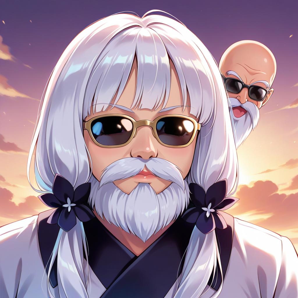 Muten roushi, dragon ball, 1boy, beard, mustache, white hair, sunglasses, bald, old man, by artist sebu illust, illustrious