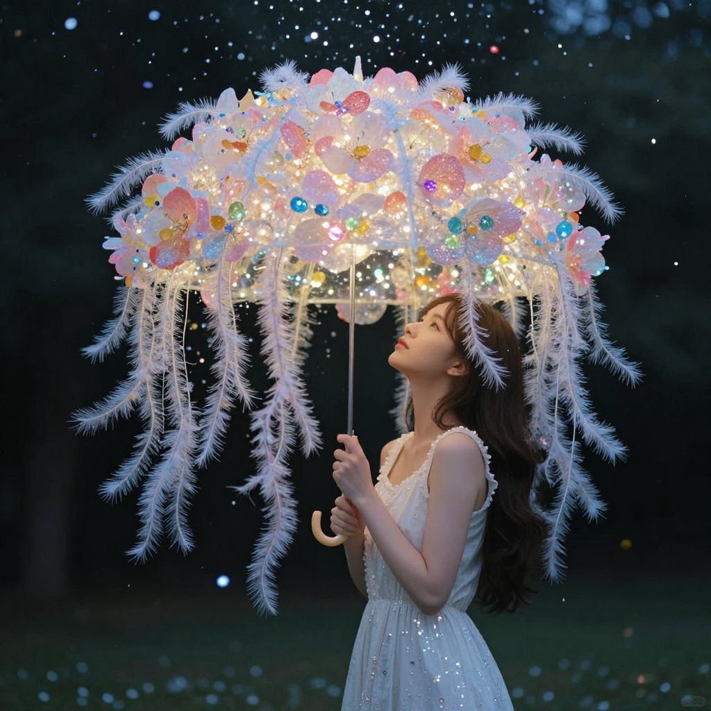 Photograph of a young woman with long brown hair wearing a sleeveless, white, sparkly dress. She holds a whimsical, glowing umbrella adorned with white feathers, pastel flowers, colorful buttons, and twinkling lights. Her head is tilted back, eyes closed, and lips slightly parted, as if in wonder. The background is a dark, blurry forest with falling specks of light, creating a magical, ethereal atmosphere. The umbrella's lights and decorations dominate the upper half of the image, contrasting with the dark, serene forest below.
