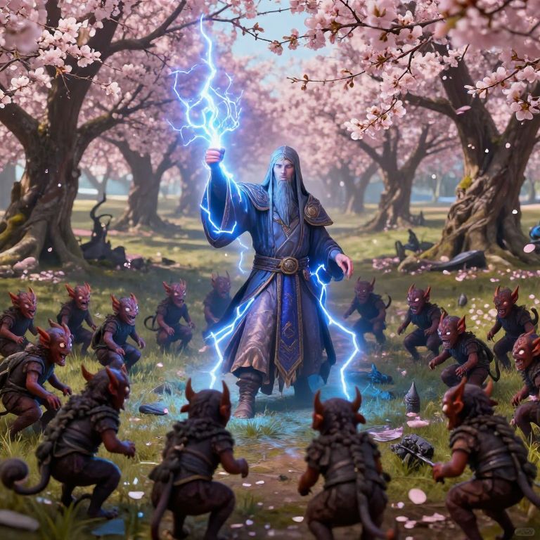 Remix a cleric casting holy lightning spell on a horde small devil monsters, cherry blossom orchard in the background, wide angle, Fantasy Illustration, Fantasy Art, high detail, vivid colors,