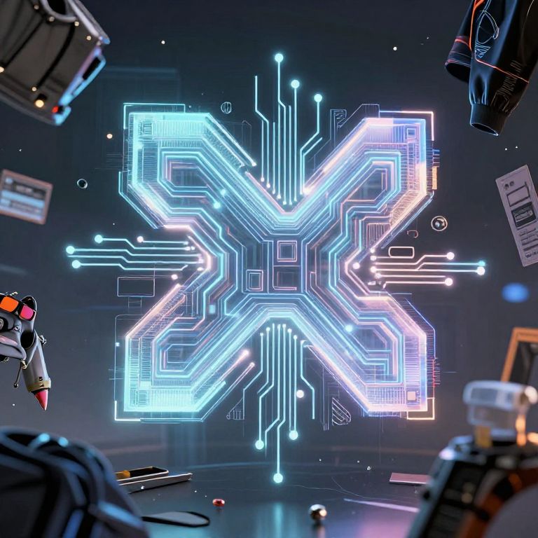 Digital illustration of a glowing 'X' shaped techwear symbol with circuit-like patterns and holographic effects, floating in a dark virtual environment. Surrounding the central symbol are fragments of futuristic streetwear clothing, highlighting the blend of technology and modern urban fashion culture.