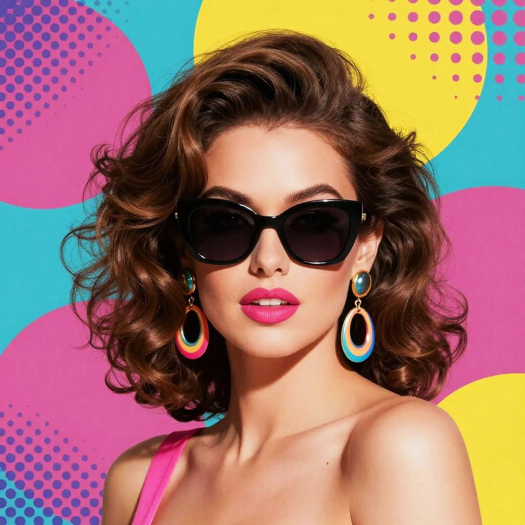 Retro artstyle portrait of a woman with big hair, bright makeup, 80s fashion, wearing large earrings and sunglasses, colorful background with abstract patterns and halftone dots