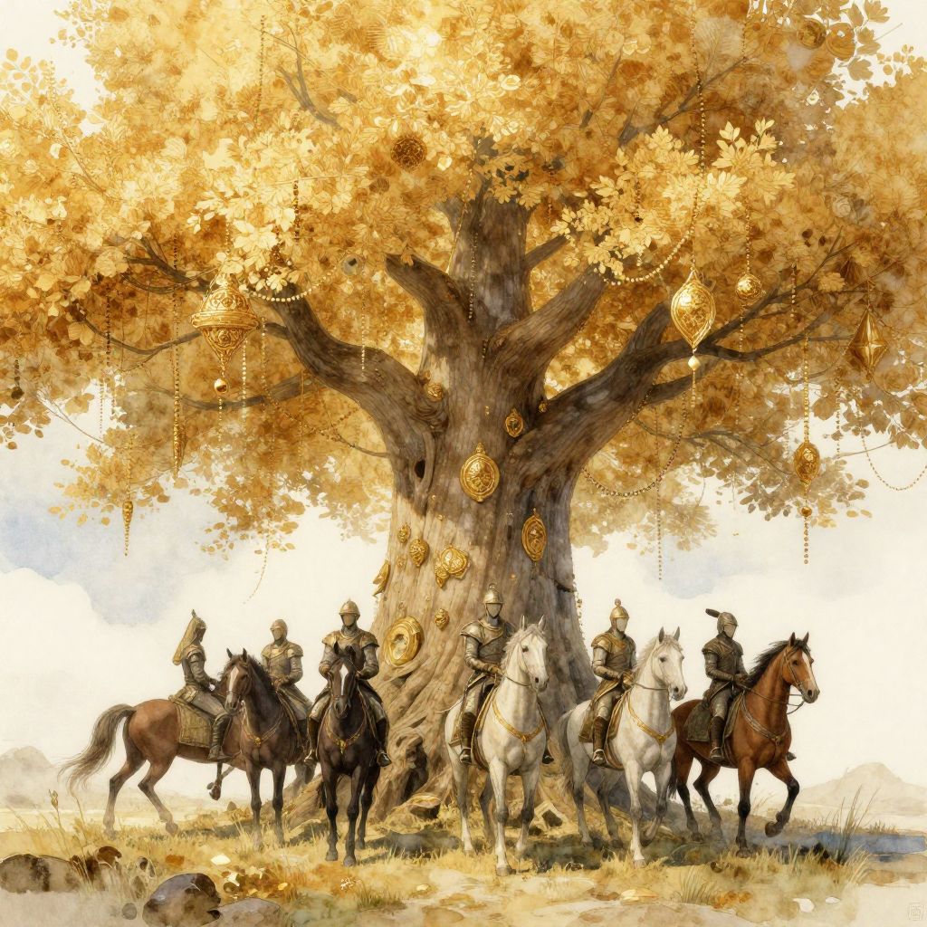 Digital art: Six armored knights on horses stand under a golden-leaved tree, adorned with hanging golden ornaments, in a sunlit meadow.