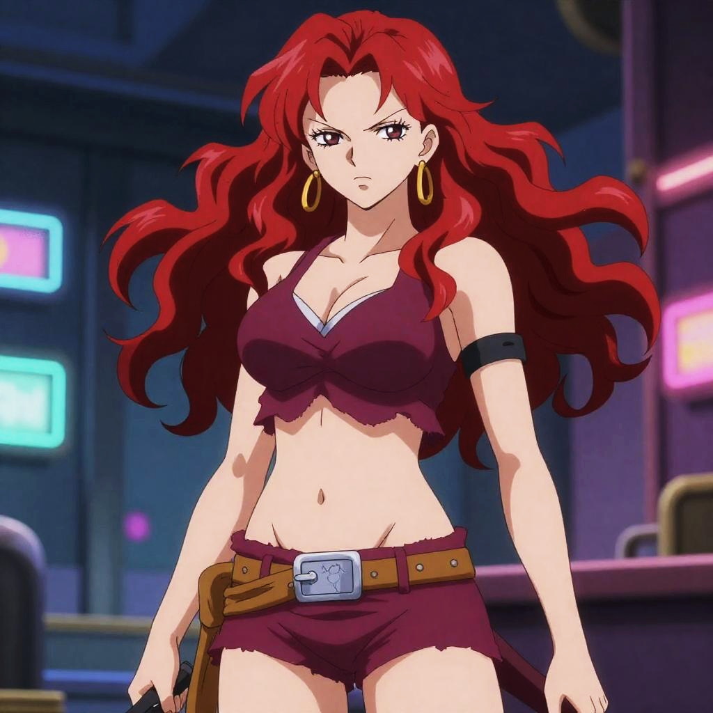 Ecchi art of siren pirate captain standing confidently in a neon-lit harbor, her fiery red hair flowing in the wind, intense gaze, high-detail anime rendering