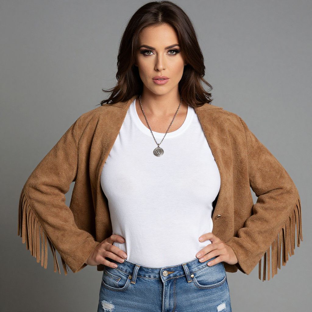 "Woman, Western, camel suede cape with fringe details, white crew neck t-shirt, denim blue jeans with distressed details, silver pendant necklace.. Sexy. Pretty face and beаutiful eyes. Big breasts."