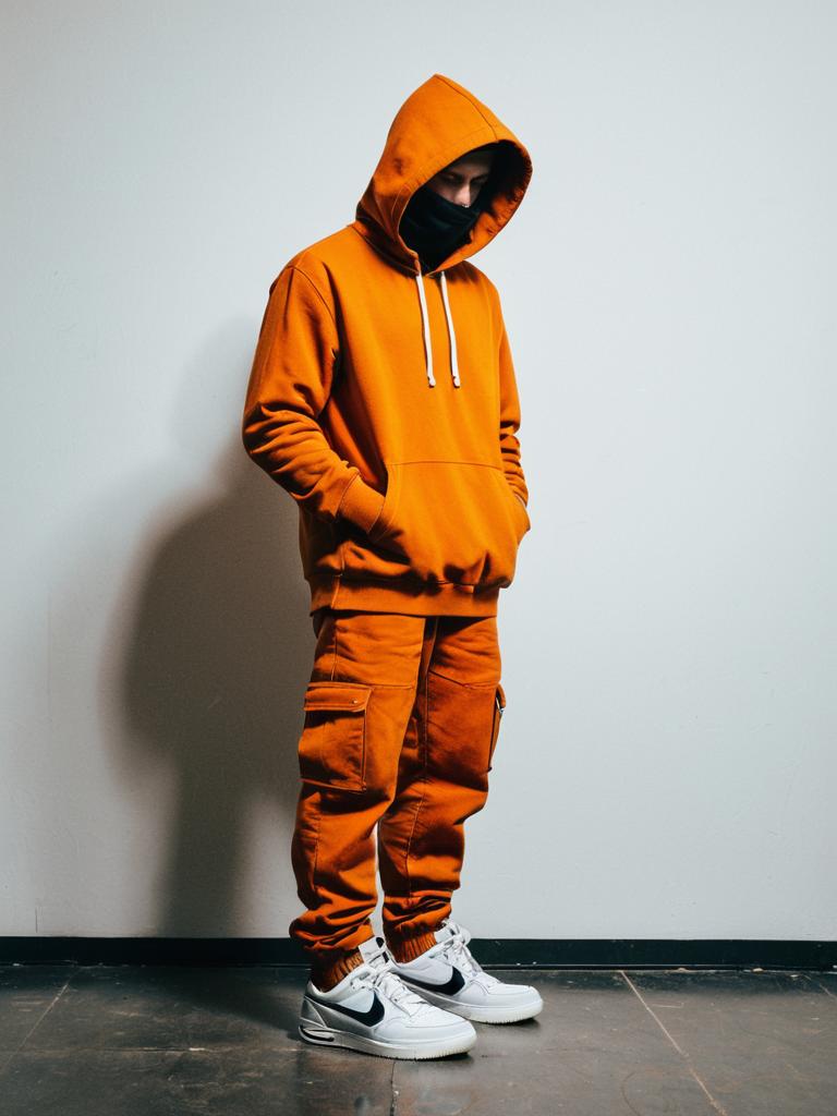 Full body portrait of a young man wearing an orange hooded sweatshirt and matching orange cargo pants. He has the hood up and his hands in the pockets of the hoodie. The man is also wearing white Nike sneakers with a black swoosh and a black face covering. He stands against a plain white wall on a concrete floor.
