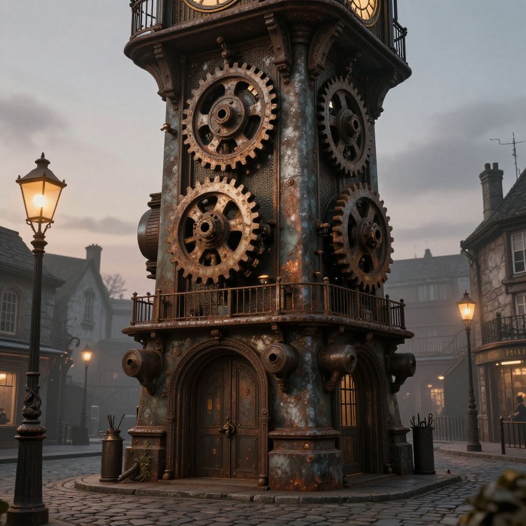 Steam punk images illustrating a clock tower with enormous exposed gears and steam vents, surrounded by cobblestone streets and vintage lampposts casting soft light, a moody twilight atmosphere with detailed textures of rusted metal and weathered stone.