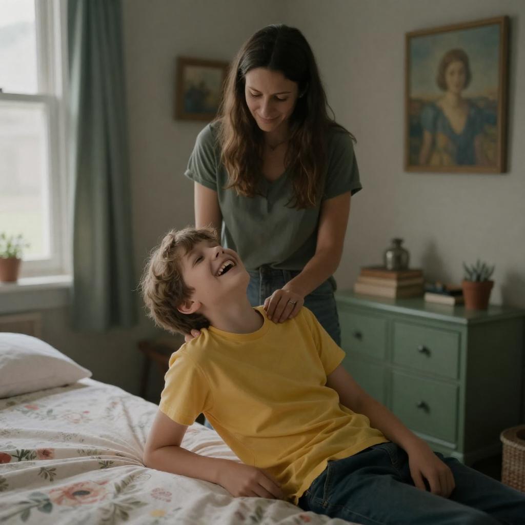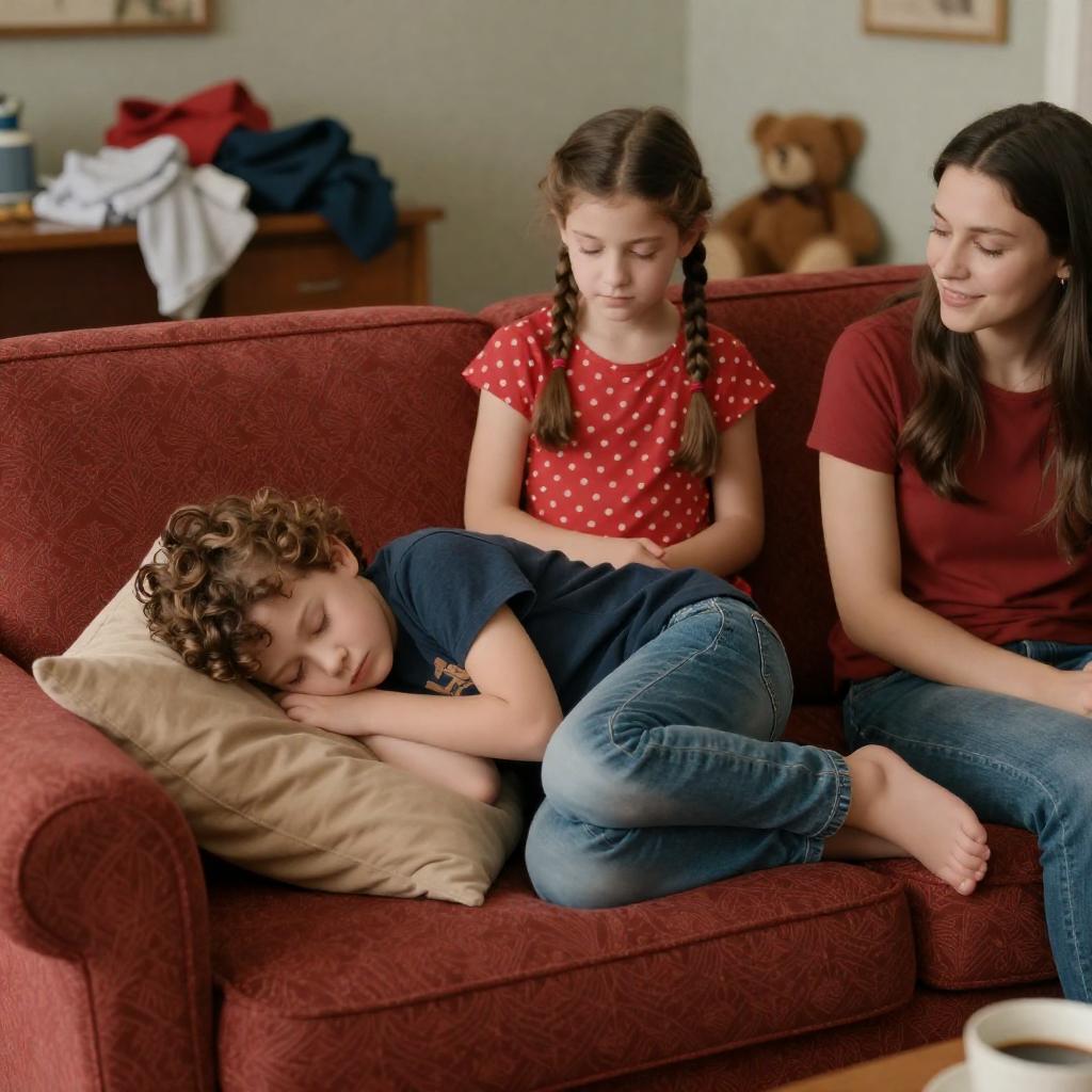 Photograph of a room. A young boy with curly hair sleeps on a red, patterned couch, covered with a pillow. A girl with braided hair and a red polka dot top stands beside him. A woman with long brown hair and a red shirt sits to the right, smiling. Background includes clothes, a teddy bear, and a cluttered table.