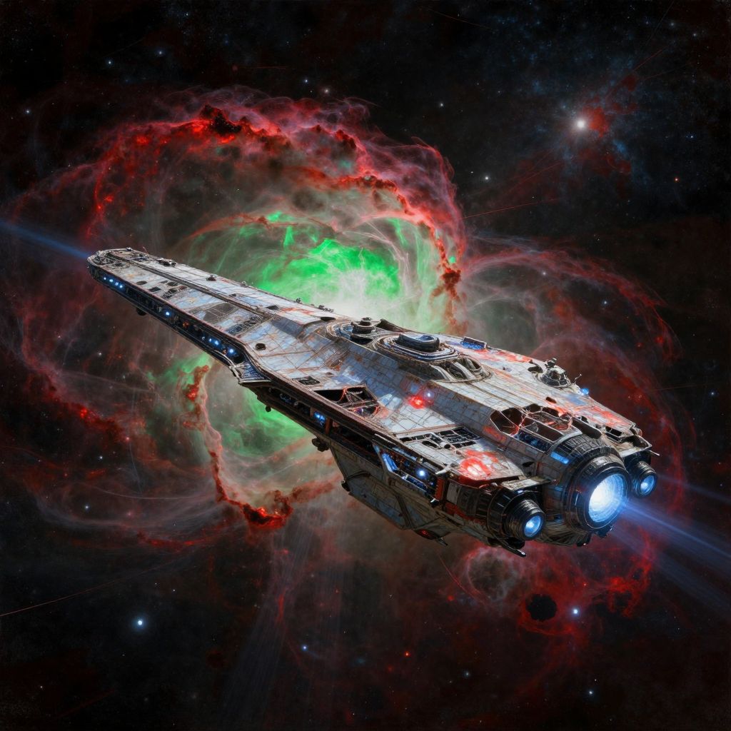 A derelict, lonely spaceship drifts aimlessly through the vast, endless expanse of space, Its sleek, high-tech hull is scarred and battered, covered in eerie scorch marks that speak of battles long forgotten, The ship's faint lights flicker sporadically, casting pale glows across its silent, empty corridors, as if it clings desperately to life, Surrounding the vessel is an ocean of stars and nebulous gas clouds, swirling in vibrant hues of crimson, teal, and gold, their beauty a stark contrast to the ship's desolation, Jagged asteroids drift nearby, their surfaces shimmering with faint reflections from the glowing nebula, Light particles float through the void, dancing like cosmic fireflies, while energy sparks leap sporadically from damaged panels, casting momentary flashes of brilliance into the surrounding darkness, Deep shadows cloak the underbelly of the ship, their tenebrous depths hinting at the horrors lurking within, The atmosphere is melancholic yet foreboding, blending vibrant colors with muted sepia tones to evoke a sense of eternal isolation, The scene is hauntingly beautiful, dissonant, and surreal, with subtle apparitions appearing in the reflections of the ship's cracked windows, A professional, painterly aesthetic captures every intricate detail, from the shimmering starlight to the faint shimmer of cosmic dust, blending Pointillism's vibrant energy with Tenebrous undertones, directional lighting, colorful, john berkey, moebius